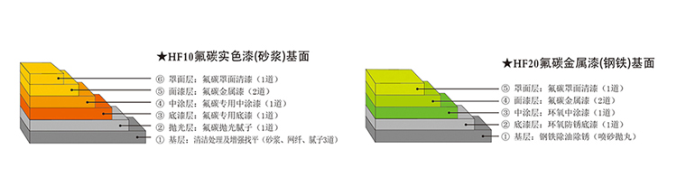 好雅麗HF10(實色)、HF20(金屬)氟碳金屬漆是采用交聯(lián)基氟碳樹脂為成膜基質(zhì)的標(biāo)準(zhǔn)型氟碳涂料體系(溶劑型、雙組份);于常溫下具有優(yōu)異交聯(lián)固化的特性,可獲得長效耐候保色、耐酸抗堿、耐鹽霧、抗UV老化、抗沾污自潔的高強性涂膜,于建筑外墻、鋼構(gòu)飾面涂裝后可經(jīng)受苛刻環(huán)境考驗,起到超長效的防護和裝飾作用。